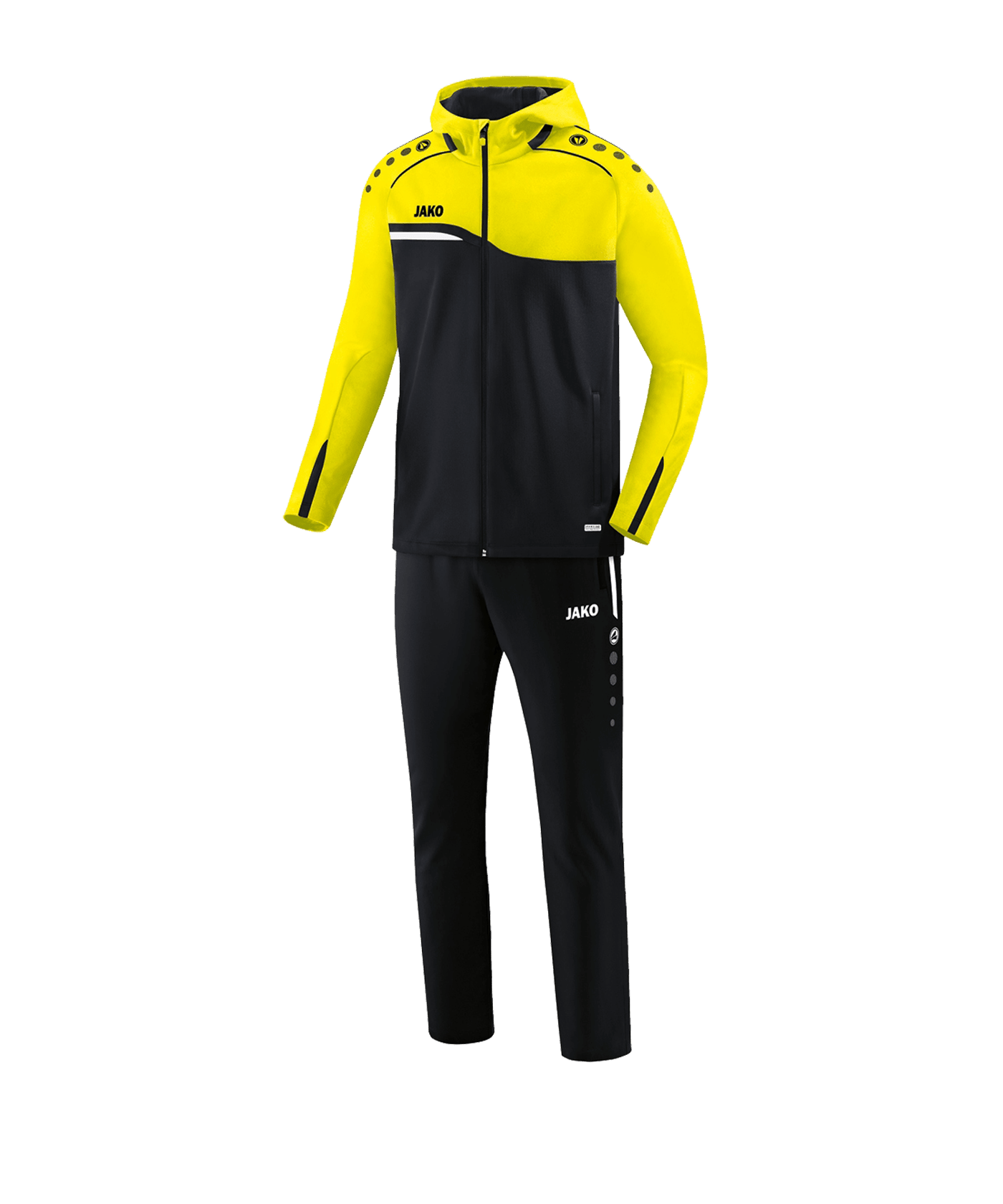 Der JAKO Damen-Anzug in Schwarz ist die perfekte Ausrüstung, mit der ihr unter Beweis stellt, was ihr könnt. Das atmungsaktive, bequeme, schweißableitende und leichte Modell überzeugt auf ganzer Linie. Ihr bekommt eine hohe Haltbarkeit geboten. Der Anzug bietet Stauraum durch die seitlichen Zipper-Taschen und wird durch einen Reißverschluss geschlossen. Durch einen modischen Stehkragen überzeugt dieser langärmlige Anzug. Ihr seid auch vor schlechtem Wetter und Wind durch die Kapuze geschützt.